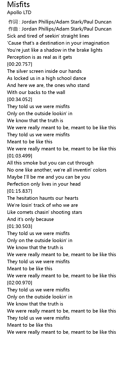 | [00:34.276] | They told us we were misfits |