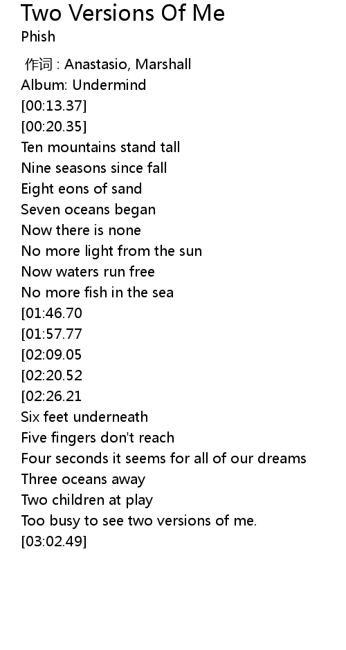| [01:23.90][02:09.05] | Too busy to see two versions of me |