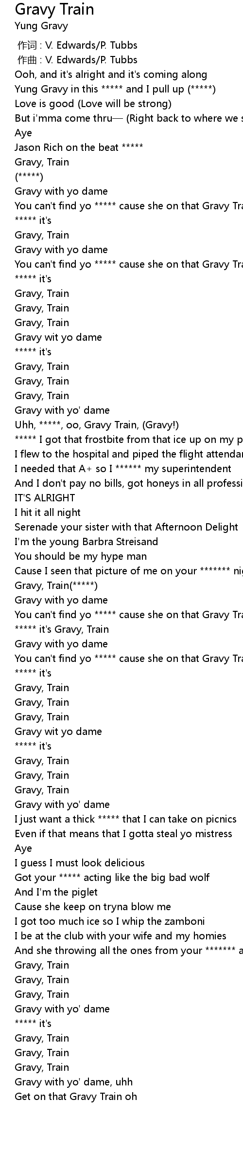 | [00:53.08] | Uhh, *****, oo, Gravy Train, (Gravy!) |