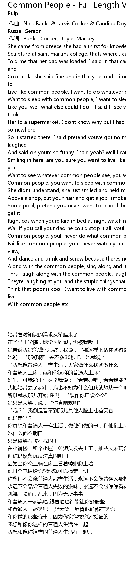 | [00:41.530] | Want to sleep with common people, I want to sleep with common people |