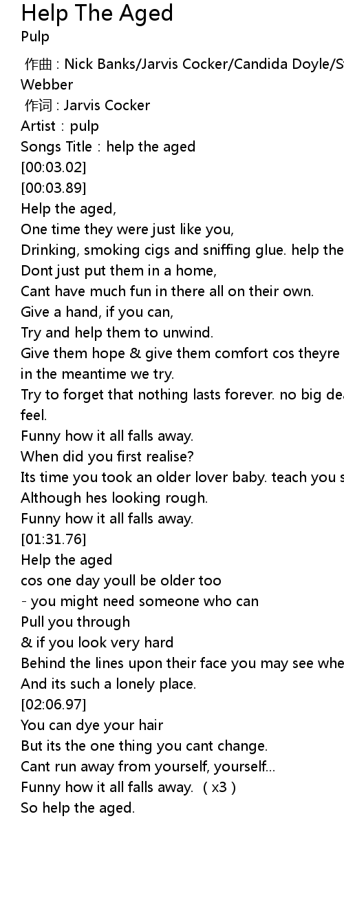 | [00:00.00] | zuo qu : Nick Banks Jarvis Cocker Candida Doyle Steve Mackey Mark Webber |