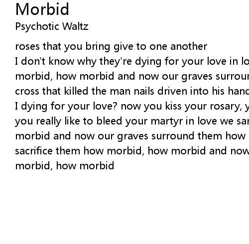 | I don't know why they're dying for your love in love we sacrifice them how morbid, how morbid and now our graves surround them how morbid, how morbid the cross that killed the man nails driven into his hand cried to the sky am | |