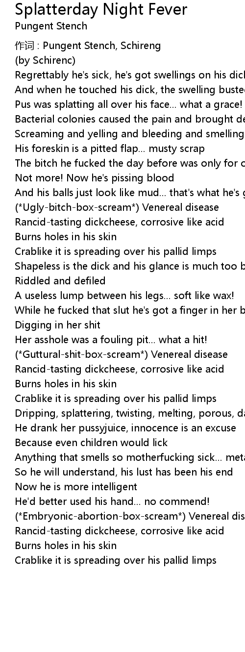 | Rancid-tasting dickcheese, corrosive like acid | |