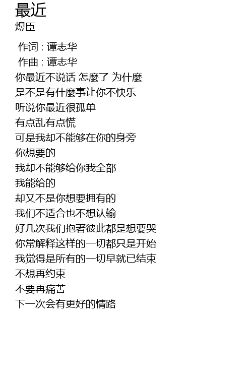 | [00:16.168] | ni zui jin bu shuo hua zen me le wei shi me |