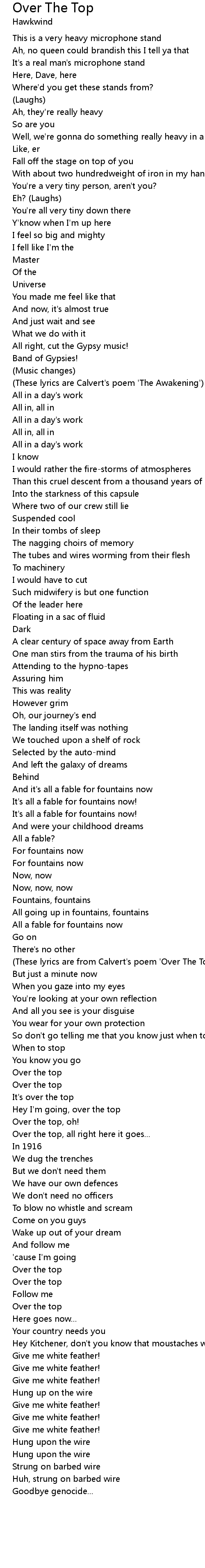(These lyrics are from Calvert's poem 'Over The Top') |