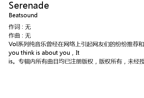 | Vol系列纯音乐曾经在网络上引起网友们的纷纷推荐和好评,这一次Beatsound又将这张珍藏多年的《Vol.4》发布至此,If you think is about you,It is。专辑内所有曲目均已注册版权,版权所有,未经授权禁止使用,如有使用需求请联系本人。 |