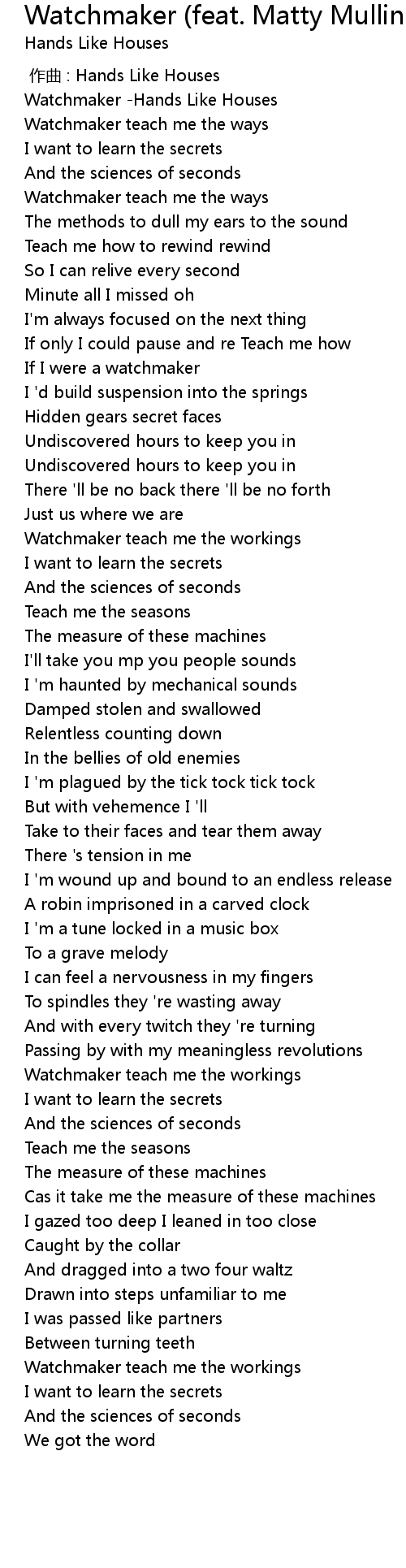 | [00:00.945] | Watchmaker Hands Like Houses |