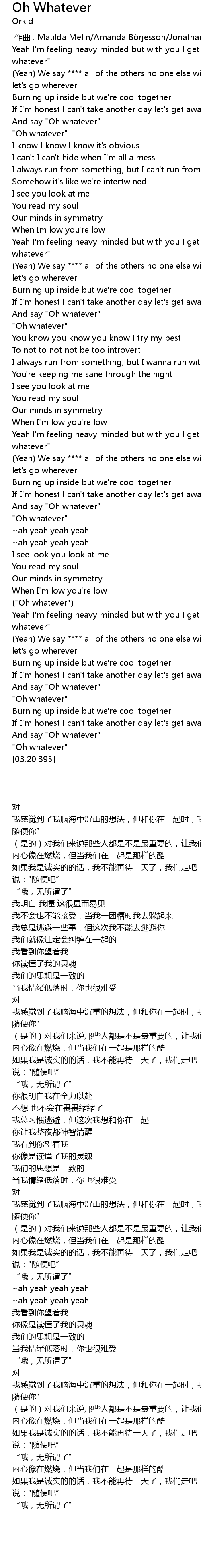 | [02:36.003] | Yeah I' m feeling heavy minded but with you I get around it sayin " Oh whatever" |