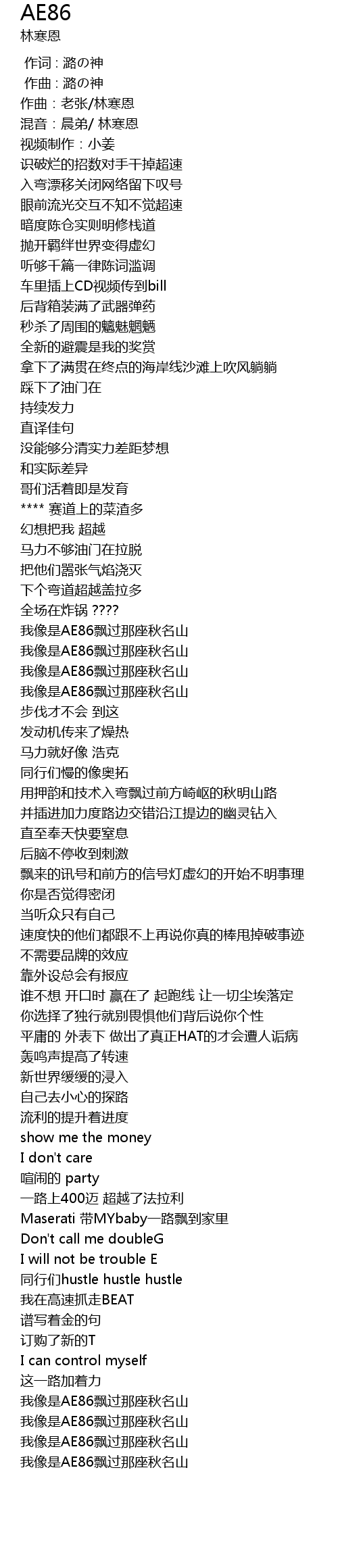| [02:41.671] | 我像是AE86飘过那座秋名山 |