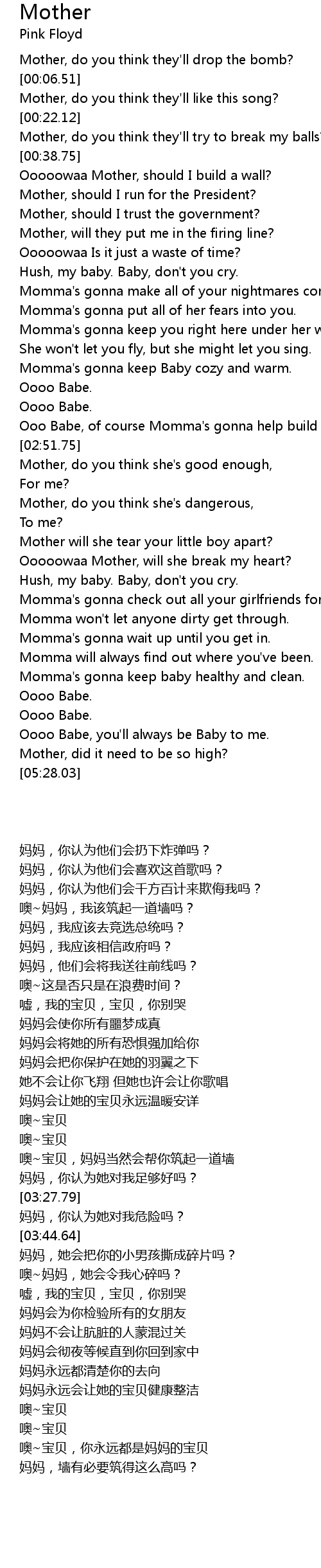 [00:00.00] Mother, do you think they'll drop the bomb?