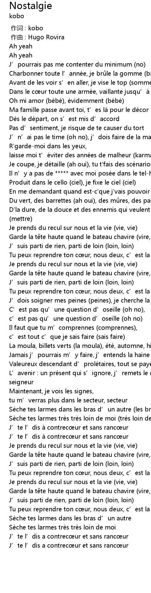 | [00:49.40] | Pas d’sentiment, je risque de te causer du tort |