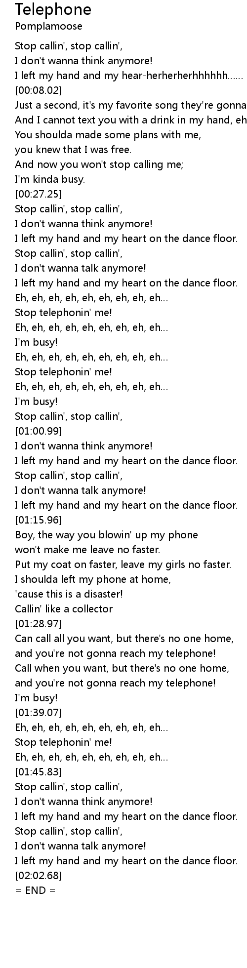 | [00:46.74] | Stop telephonin' me! |