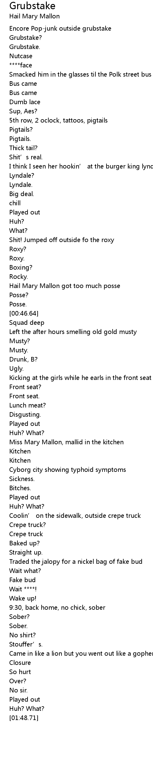 | [00:42.54] | Hail Mary Mallon got too much posse |