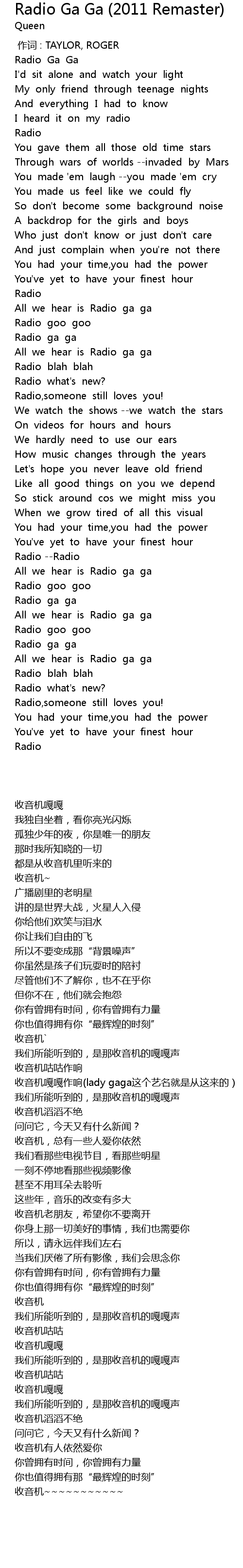 | [02:10.476] | 收音机嘎嘎作响(lady gaga这个艺名就是从这来的) |
