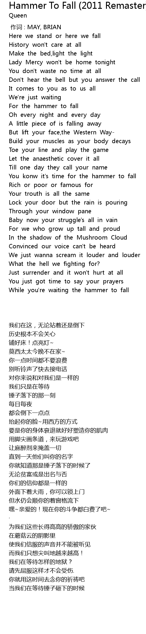 | 歌曲 | Hammer To Fall (2011 Remaster) |
