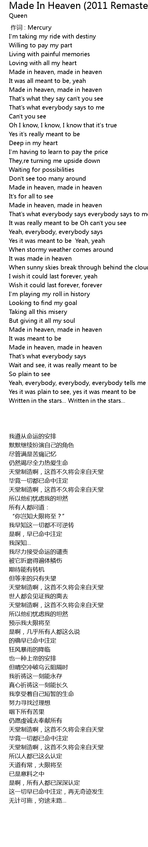 | [00:33.100] | Made in heaven, made in heaven |