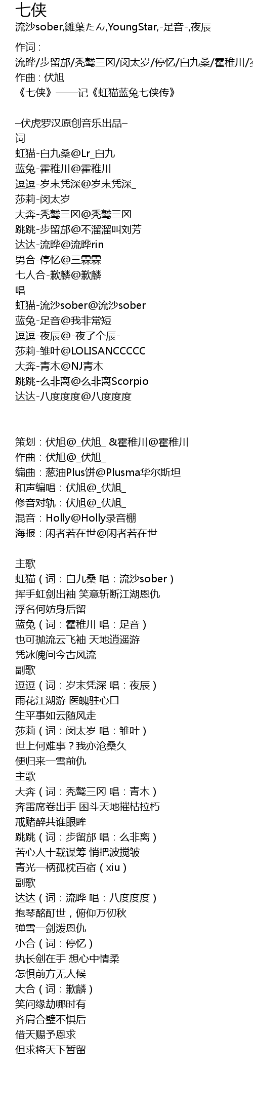 | 作词 : 流晔/步留邡/秃鹫三冈/闵太岁/停忆/白九桑/霍稚川/岁末凭深/歉麟 | |