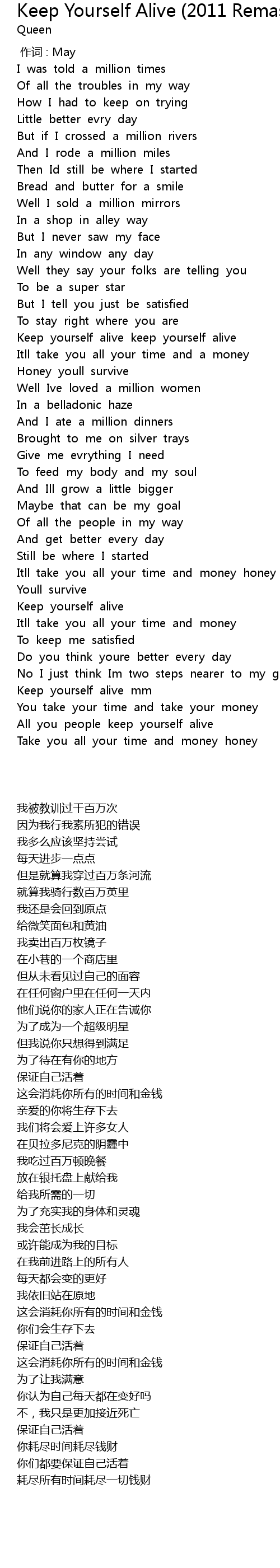 | [01:05.79] | Keep yourself alive keep yourself alive |
