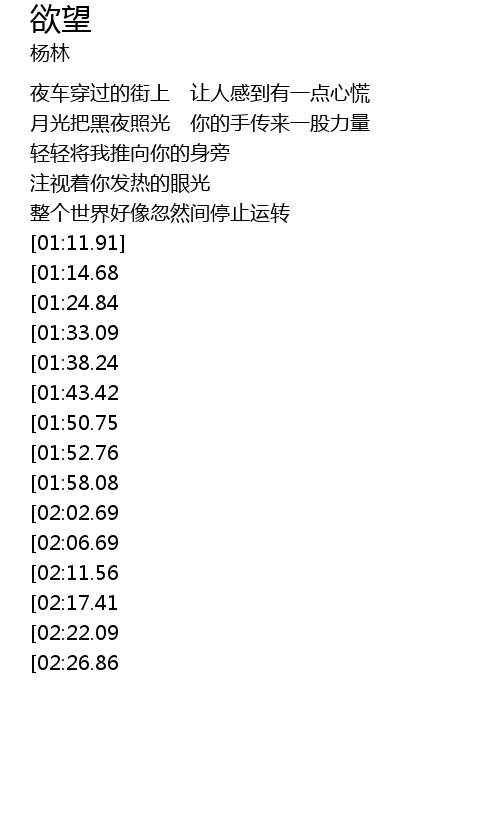 | [02:52.23][01:14.68] | *街灯照在你脸上 让你看起来有种欲望 |