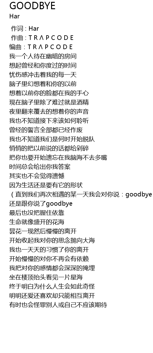 | [01:35.704] | hái shì gēn nǐ shuō le goodbye |