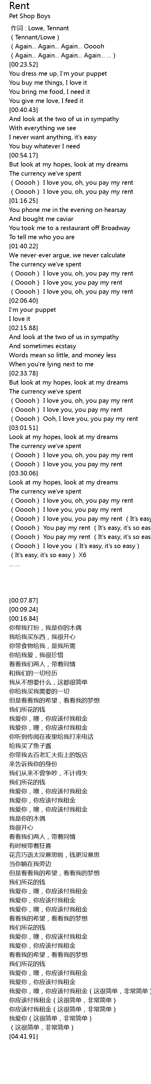 | [03:53.22] | 我爱你,噢,你应该付我租金(这很简单,非常简单) |