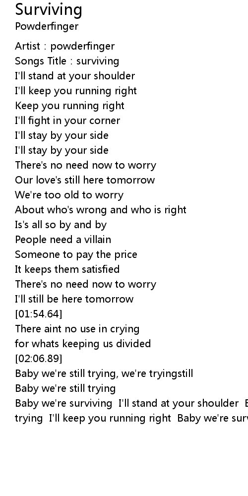 | [02:37.18] | Baby we're surviving I'll stand at your shoulder Baby we're still trying I'll keep you running right Baby we're surviving |