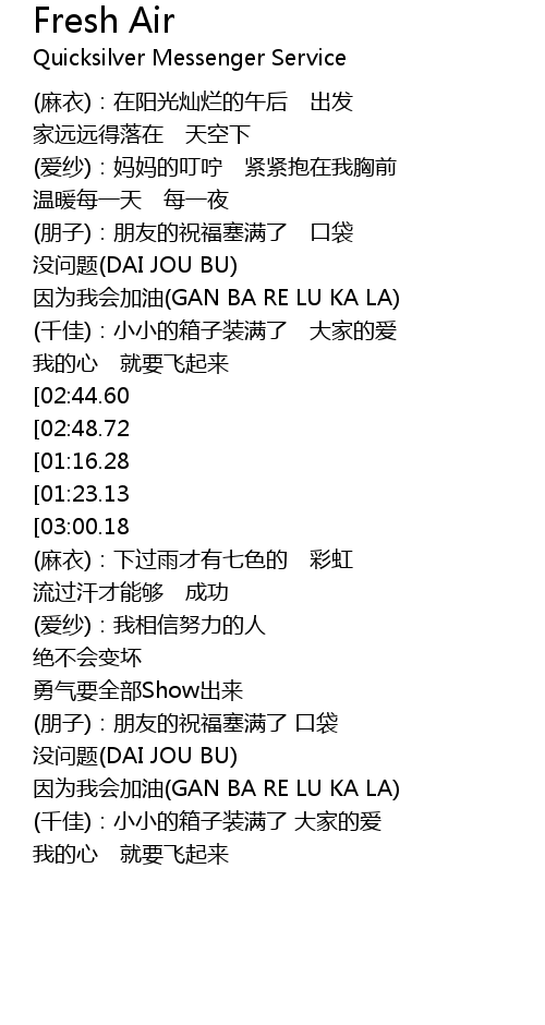 | [02:50.17][01:16.28] | ni hui kan jian wo zai tian kong ao xiang Fresh Fresh Fresh |