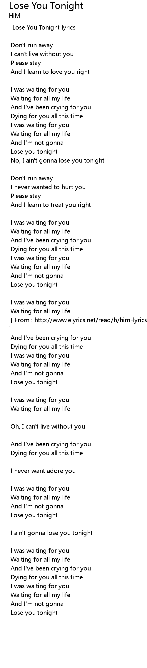 [ From : http://www.elyrics.net/read/h/him-lyrics/lose-you-tonight-lyrics.html ] |