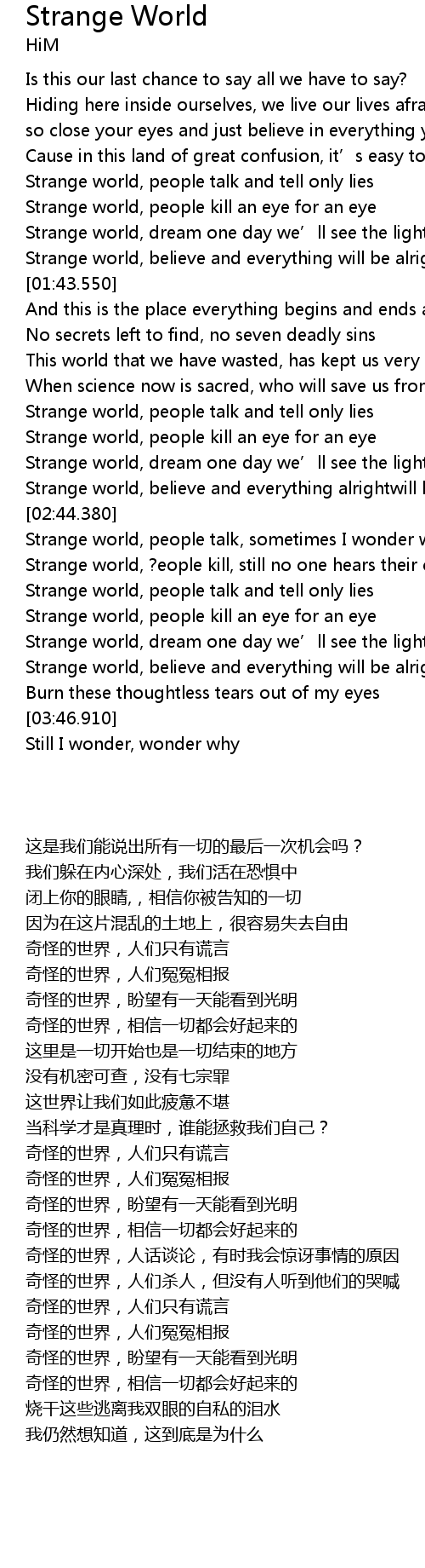 | [03:25.700] | Strange world, dream one day we’ll see the light |
