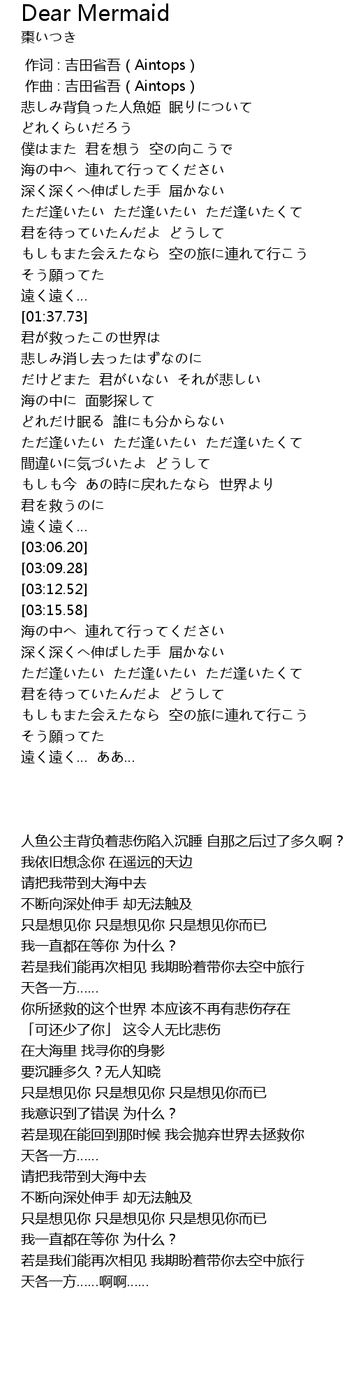 | [00:15.42] | 人鱼公主背负着悲伤陷入沉睡 自那之后过了多久啊? |