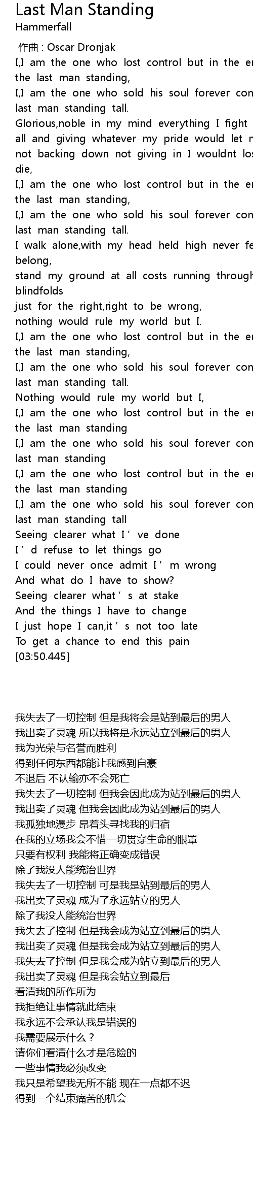 | [02:58.540] | I, I am the one who sold his soul forever come to be the last man standing tall |