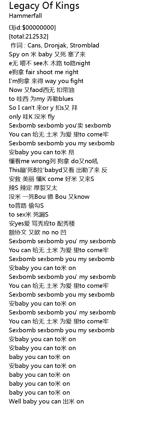 | [02:06.52] | Sexbomb sexbomb you my sexbomb |