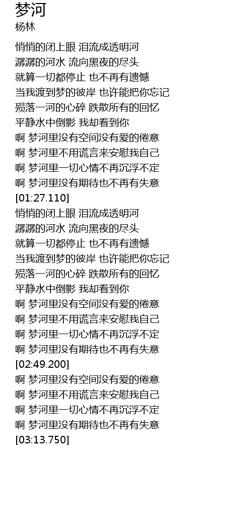 | [03:00.910] | 啊 梦河里一切心情不再沉浮不定 |