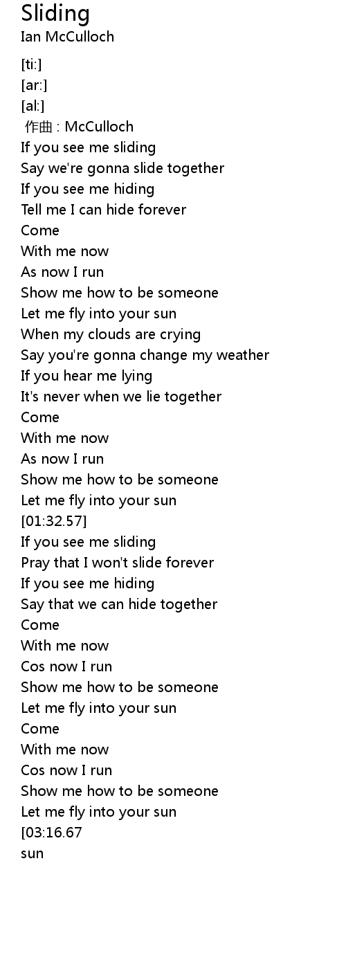 | [03:19.32][03:16.67][03:14.24][03:11.58][03:09.05][03:06.47][03:04.04][03:01.66][02:59.28][02:56.70][02:54.38][02:51.95][02:49.42][02:46.95][02:44.47][02:42.10] | your sun |