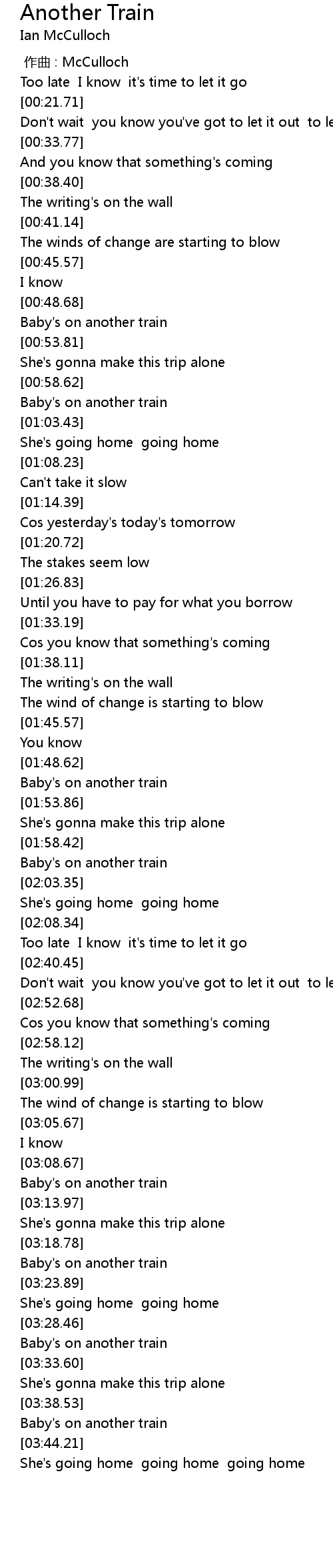 | [02:00.35] | Baby's on another train |