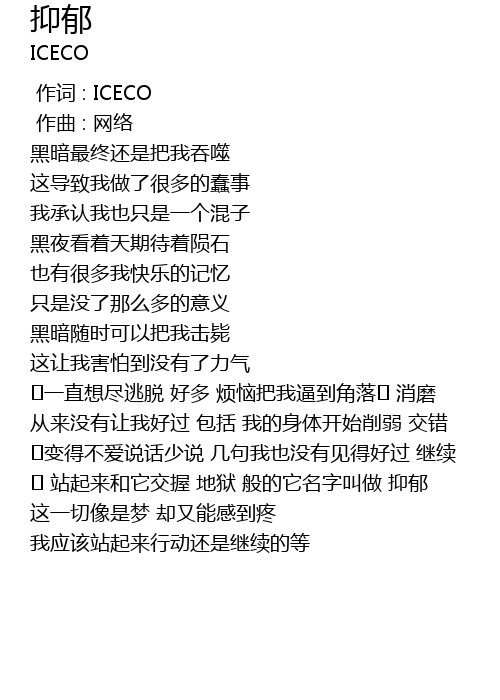 | [00:55.206] | 站起来和它交握 地狱 般的它名字叫做 抑郁 |