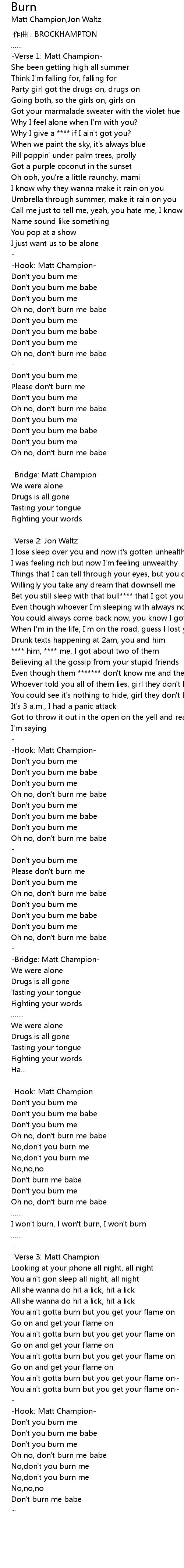 | [03:58.397] | Oh no, don' t burn me babe |