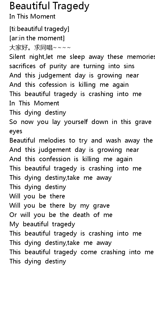 | [01:49.302] | This beautiful tragedy is crashing into me |