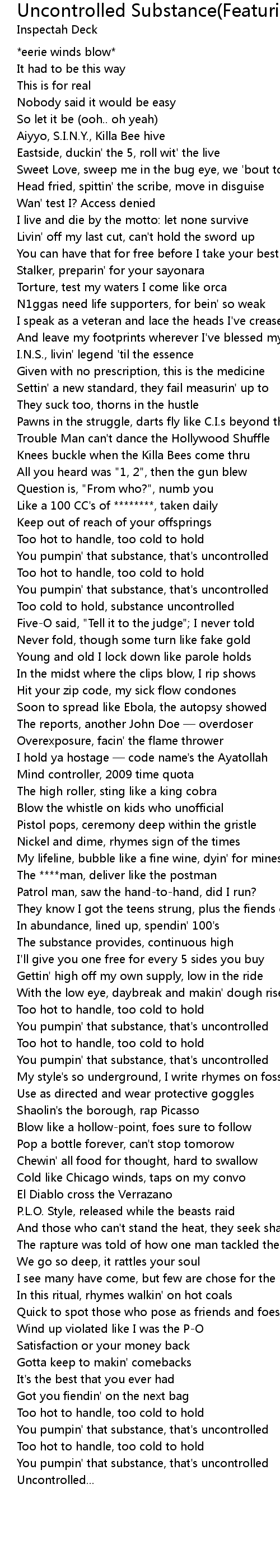 | [01:48.29] | You pumpin' that substance, that' s uncontrolled |