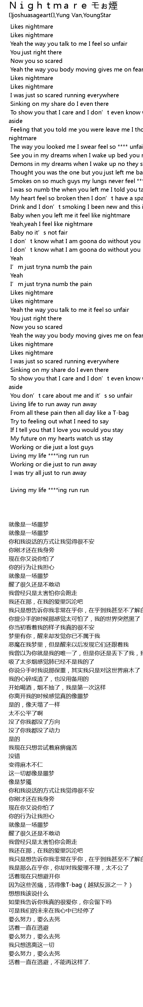 | [01:24.539] | Yeah, yeah I feel like nightmare |