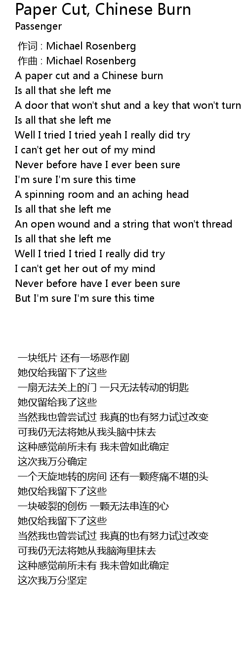 | [00:22.36] | A paper cut and a Chinese burn |