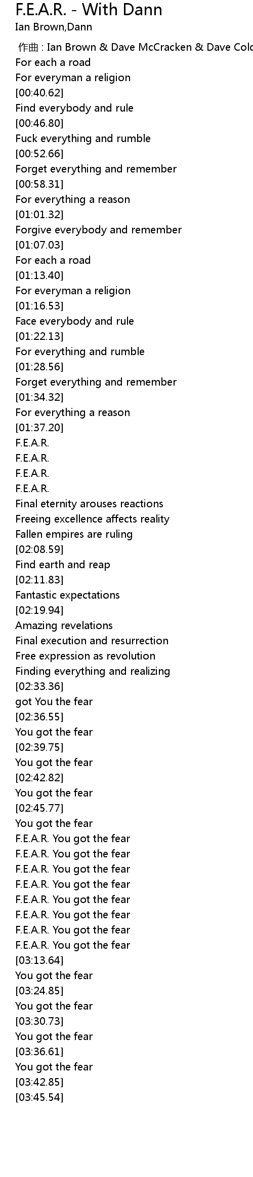 | [03:02.29] | F.E.A.R. You got the fear |