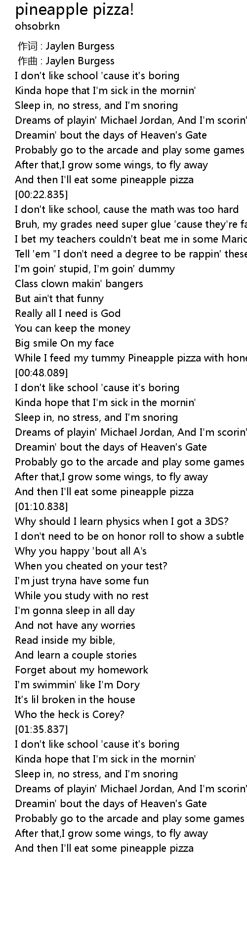 | [01:08.087] | And then I'll eat some pineapple pizza |