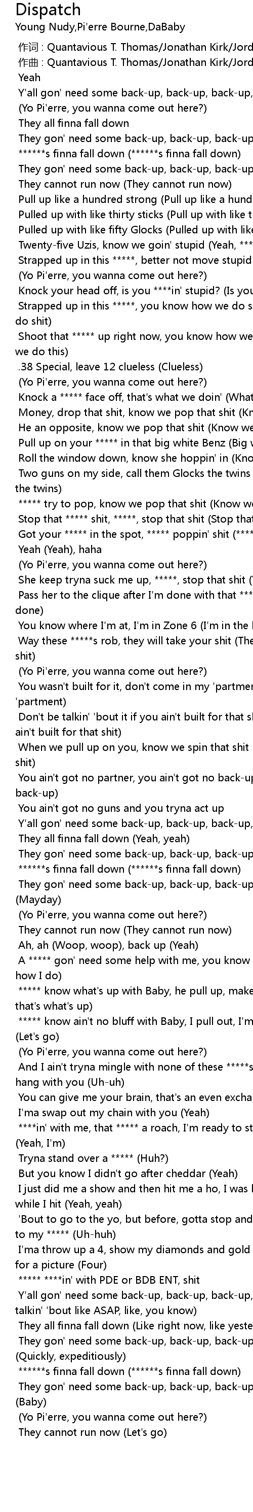 | [02:44.348] | They gon' need some back-up, back-up, back-up, back-up, mayday (Quickly, expeditiously) |