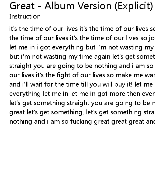 it's the time of our lives it's the time of our lives so let's get started! it's the time of our lives it's the time of our lives so join the party! let me in let me in i got everything but i'm not wasting my time again let me in let me in but i'm not wasting my time again let's get something, let's get something straight you are going to be nothing and i am so fucking great it's the fight of our lives it's the fight of our lives so make me want it! i'm a part of the lies and i'll wait for the time till you will buy it! let me in, let me in i got everything let me in let me in got more then everything! let's get something, let's get something straight you are going to be nothing and i am so fucking great let's get something, let's get something straight you are going to be nothing and i am so fucking great great great and i am so fucking great |