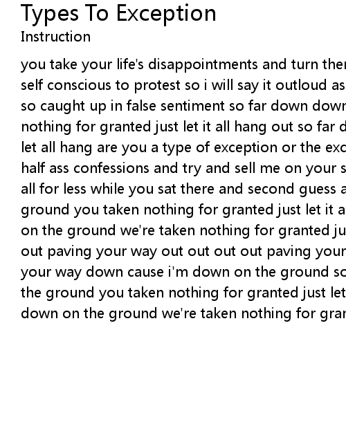 you take your life's disappointments and turn them into self doubt you're too self conscious to protest so i will say it outloud as i write your wrongs again so caught up in false sentiment so far down down on the ground we're taken nothing for granted just let it all hang out so far down down on the ground just let all hang are you a type of exception or the exceptional type? go take your half ass confessions and try and sell me on your self doubt cause i bought it all for less while you sat there and second guess again so far down down on the ground you taken nothing for granted just let it all hang out so far down down on the ground we're taken nothing for granted just let it all hang out out out out paving your way out out out out paving your way again out out out out paving your way down cause i'm down on the ground so far down again so far down down on the ground you taken nothing for granted just let it all hang out so far down down on the ground we're taken nothing for granted just let it all hang out |