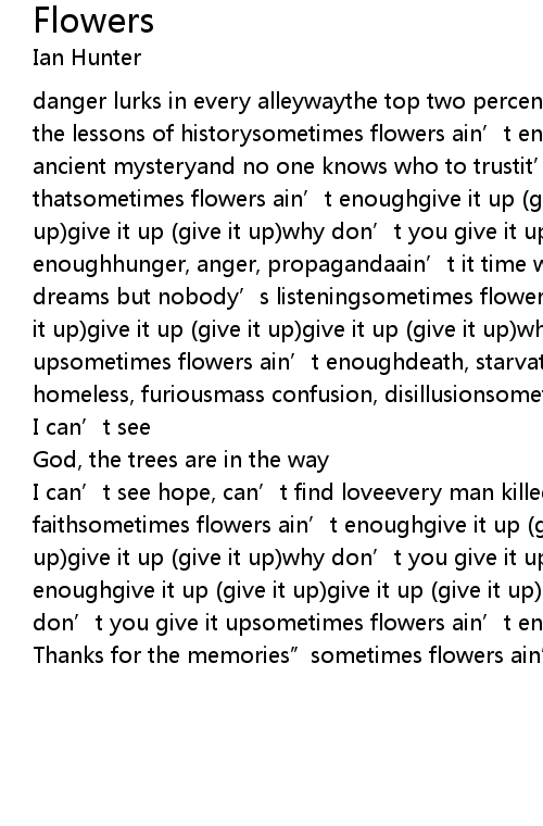 | danger lurks in every alleywaythe top two percent out of touchno one learns from the lessons of historysometimes flowers ain' t enoughthey fill your heart with ancient mysteryand no one knows who to trustit' s too late when you discover thatsometimes flowers ain' t enoughgive it up give it up give it up give it up give it up give it up why don' t you give it upsometimes flowers ain' t enoughhunger, anger, propagandaain' t it time we all grew upand we all got dreams but nobody' s listeningsometimes flowers ain' t enoughgive it up give it up give it up give it up give it up give it up why don' t you give it upsometimes flowers ain' t enoughdeath, starvation, exploitationhelpless, homeless, furiousmass confusion, disillusionsometimes flowers ain' t enough | |