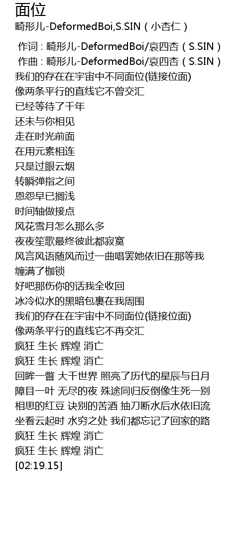 | [00:01.000] | zuò qǔ : jī xíng ér DeformedBoi āi sì xìng S. SIN |