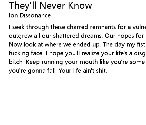 | I seek through these charred remnants for a vulnerable person I once knew. We outgrew all our shattered dreams. Our hopes for the future were as bold as any. Now look at where we ended up. The day my fist comes into contact with your fucking face, I hope you'll realize your life's a disgrace. You white trash bitch. Keep running your mouth like you're some kind of know it all. You know you're gonna fall. Your life ain't shit. |