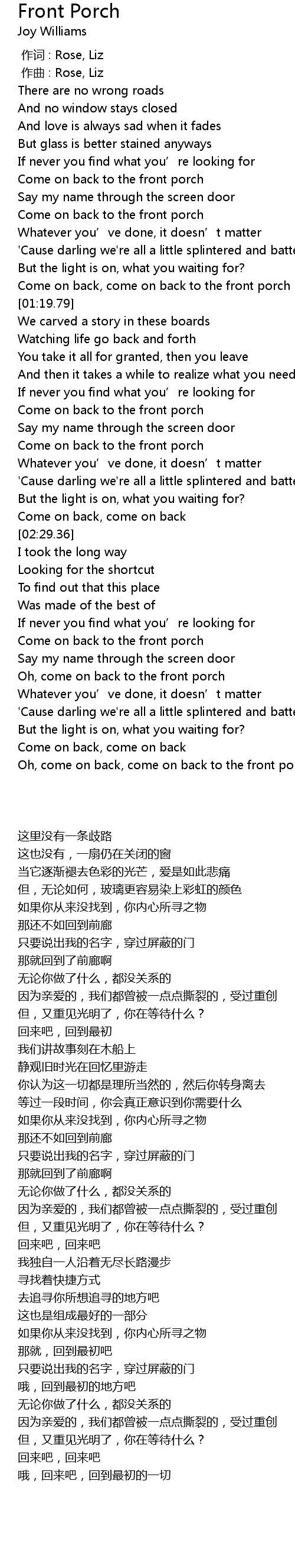 | [03:27.30] | Oh, come on back, come on back to the front porch |